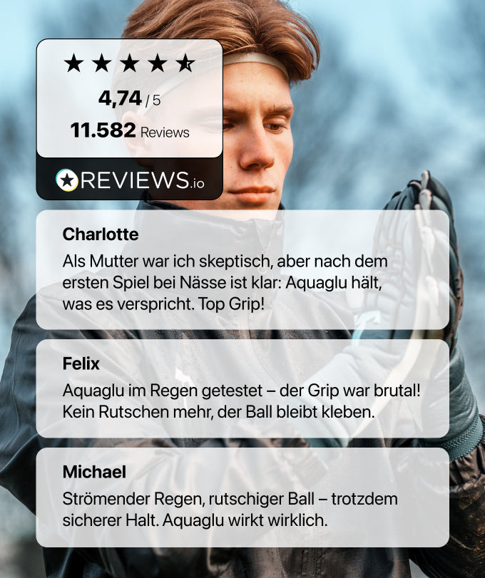 AQUAGLUは雨や濡れた状態でも使用できます。雨が降ったら、定期的にグローブを握り、絞ることをお勧めします。 そうすることで、ボールが当たる前にパームから水分を取り除くことができます。 乾燥した天候の場合は、TURBOGLUをお勧めします。